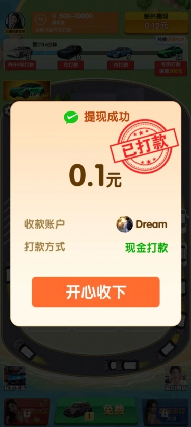 4、等你合成到12级的小车就可以解锁小米yu7了,而且还有红包奖励等着你