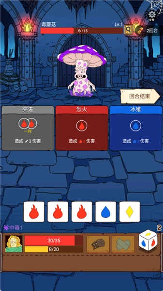 5、玩家在15回合内击败敌人,每回合开始时从牌库抽取3张卡牌,通过投掷骰子激活卡牌效果进行攻击或防御。