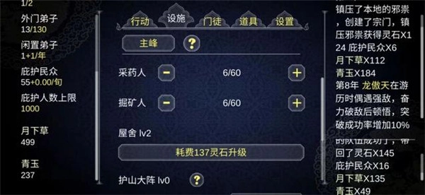 3、为了养活门派所有的弟子,你每天都要去做各种事情,不断生产建设。
