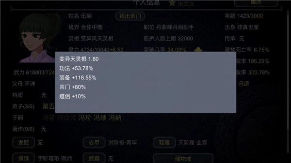 举例:变异天灵根+功法53.78%+装备加成118.55%+宗门加成80%+道侣10%,最终速度=1.8*(1+53.78%+118.55%+80%+10%)=6.52194,如下图