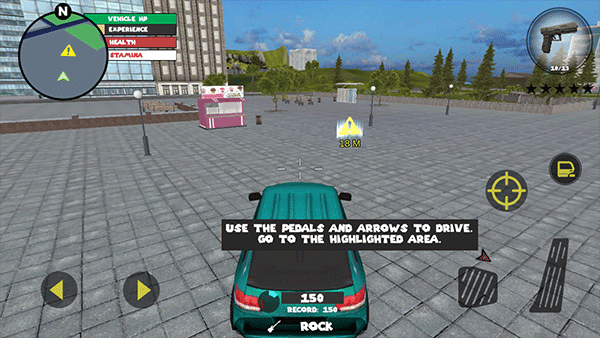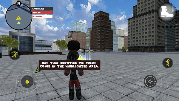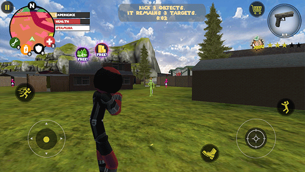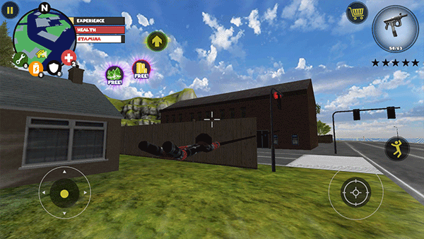 在游戏操作方面,左侧可实现移动与加速,右侧关联绳索、攻击(攻击时还能结合跳跃动作)以及单纯的跳跃操作。右上侧设有武器更换功能,同时血量与经验的显示会实时更新,所有信息清晰呈现、一览无遗。玩家能够凭借自身自由的玩法,与其他帮派的角色展开交火。在交火过程中,成功杀人可获取经验,若击杀数量较多,便会产生星级。一旦星级出现,警察以及其他附近的角色就会对你格外“关照”,向你发起猛烈进攻。此时,如何在这场激烈的对抗中存活下来,以及怎样将其他人物成功击杀,就成为了你需要完成的任务。