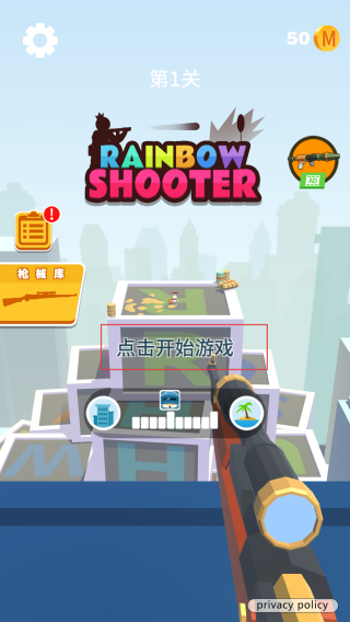 1、玩家完成游戏后点击进入,在游戏主界面,点击图标并点击开始游戏按钮,进入彩虹射戏关卡。