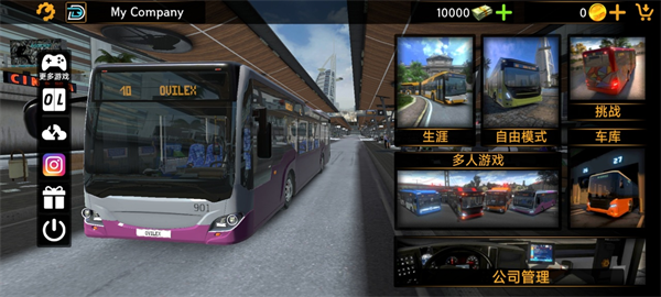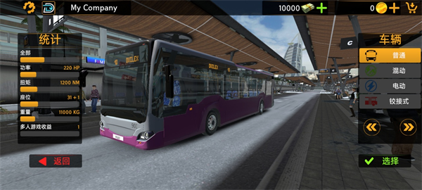 5、挑选一辆最契合自身需求的车辆,游戏中设有多种类型的巴士,包括常规/柴油、混合动力、电动以及铰接式巴士,任你选择。每类公交车的属性各异,购置所需的金额也不尽相同。你初始仅有10000金币,唯有通过持续接送顾客,逐步扩大公司规模,方能积攒更多资金。