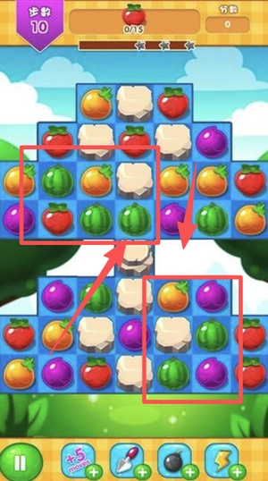 2、用手指滑动,连三个或更多相同水果,消除后能爆炸清理更多地方。