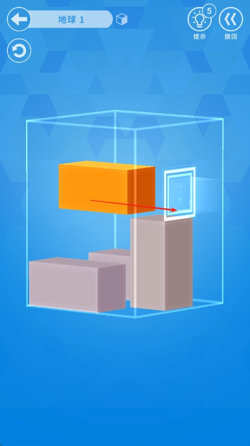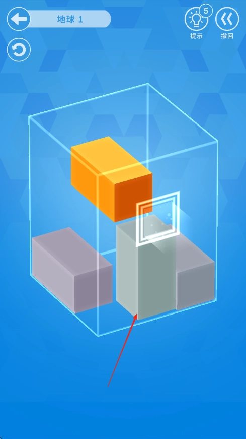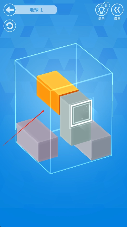 1、进入地球1关卡,观察透明立方体内方块布局,按红箭头方向明确橙色方块移动初始方向。