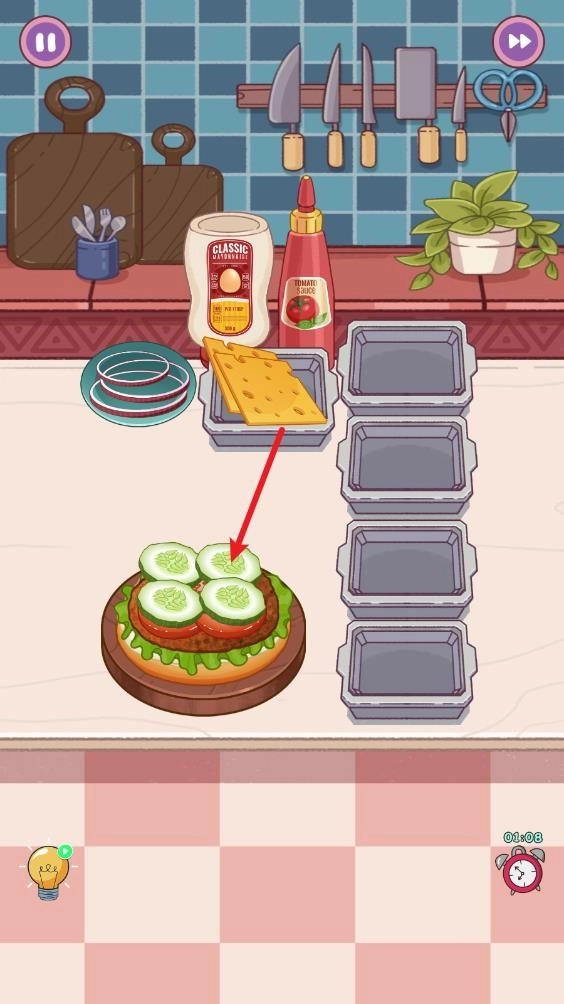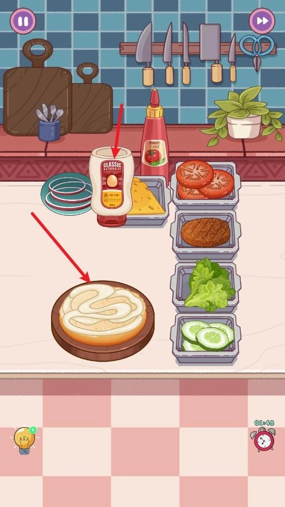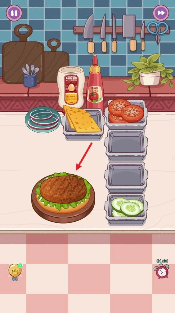 2. 每一个关卡都具备独特的解法,就拿制作汉堡关卡来说,第一步要点击沙拉酱,从而开启制作流程。