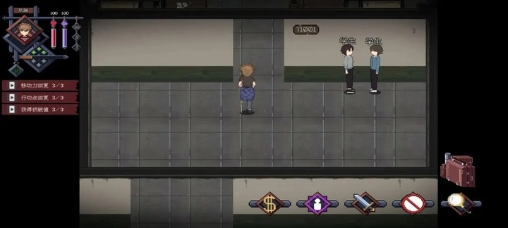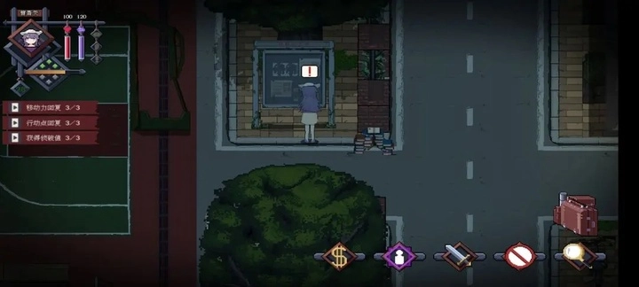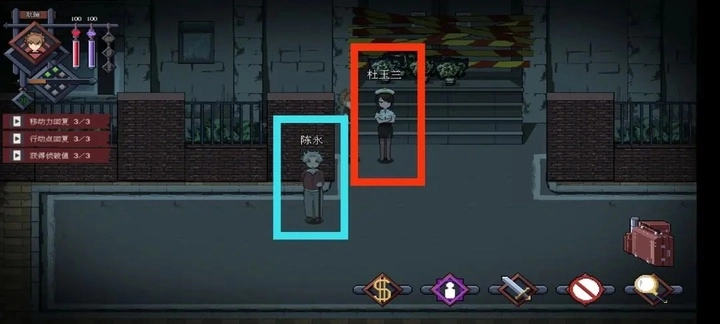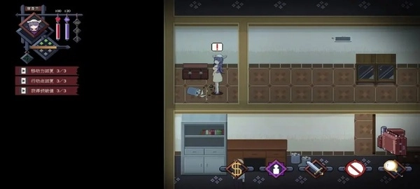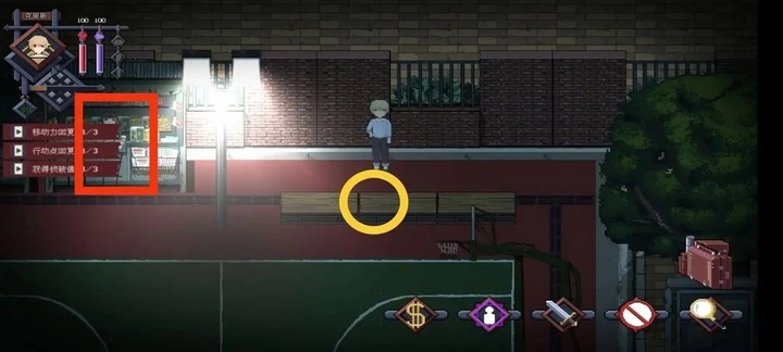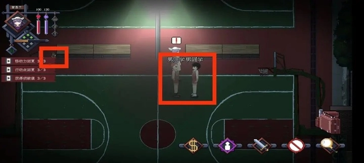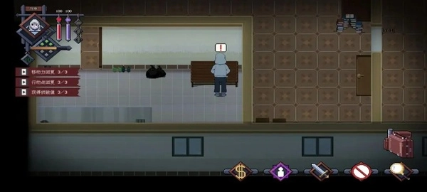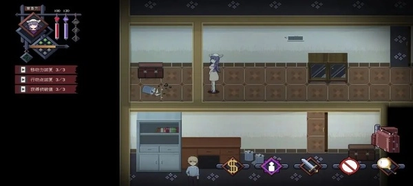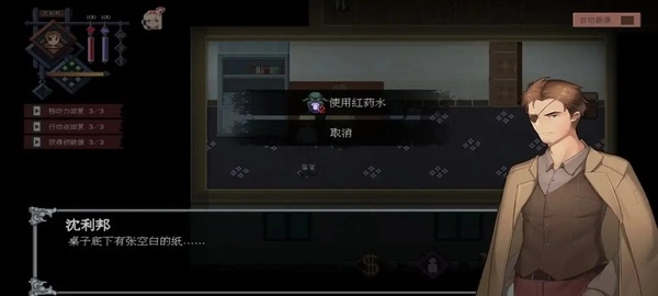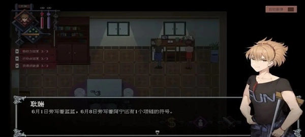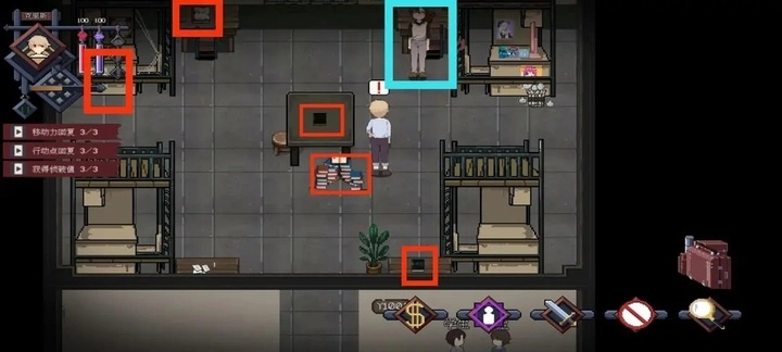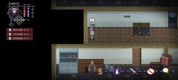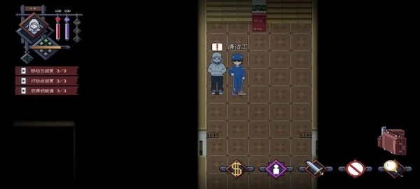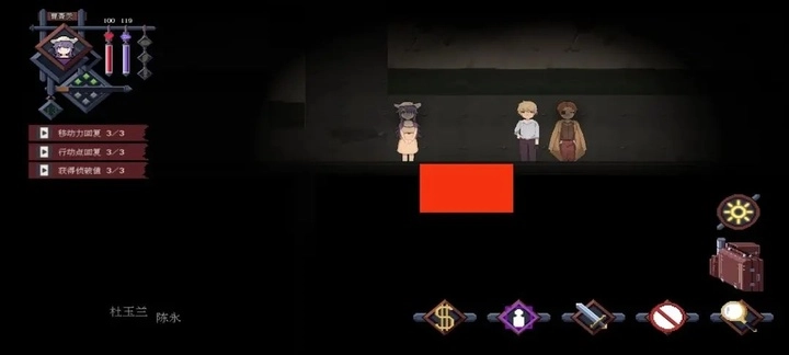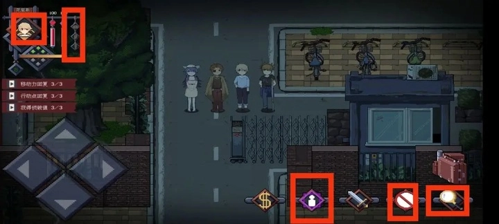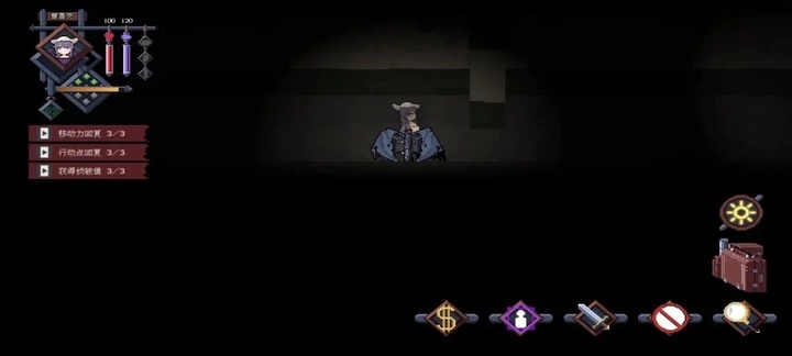 右下角的图标,第一个是交易图标,主要用于队内物资协调,每个人物在自己的行动轮中可使用一次。第二个图标与左上角的三个小图标存在联动关系,涉及相关判定位,但序章阶段不会用到。第三个图标是战斗键,用于发起战斗,在游戏过程中使用频率较高,不过每次使用会消耗三点行动点,这点需要特别留意。