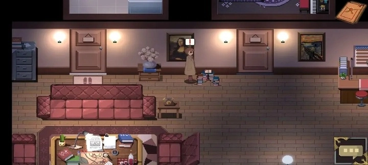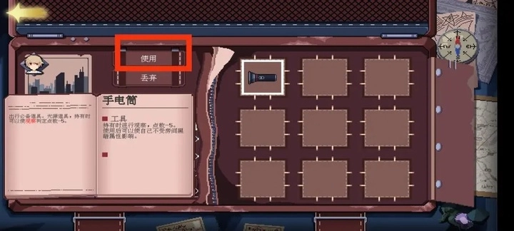 从这里开始就进入黑暗环境了,在走廊上需要依靠手电筒和油灯来照明。不过,有几个房间设有电灯开关,能够开灯,只是部分灯已经损坏。操作方法很简单,点击行李图标,接着点击想要使用的物品,再点击“使用”,就完成啦!使用后,行李图标上方会出现一个类似小太阳☀的灯光标志。