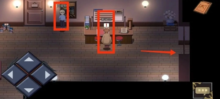 往右上是宿舍,在门前出现感叹号的地方点右下角的放大镜图标就可以进去了。