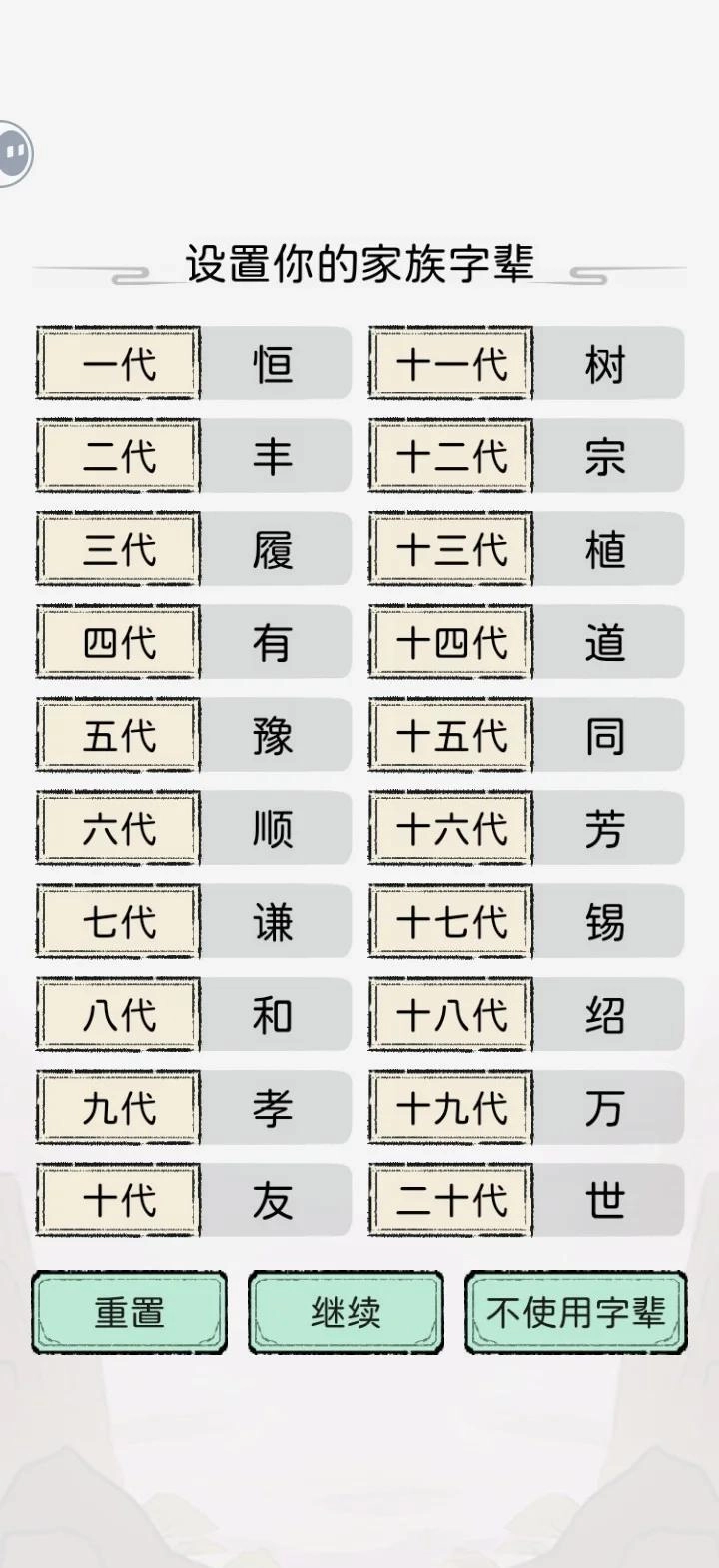 1、开局选择字辈等传宗接代的内容。