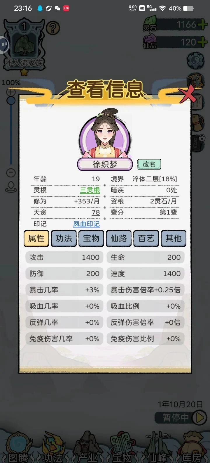4、查看信息,属性功法,都是慢慢累积体验。