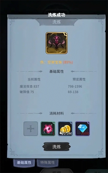 魔器吞噬完就可以进行洗练了,洗练分两种,一种事洗练攻击值和破障值,第二种是洗练特殊属性的数值