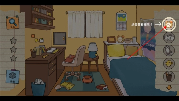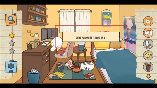 3、右侧是需要找到的猫咪和物品,点击可查看提示,辅助寻找。