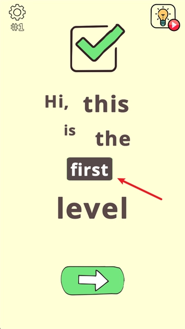 1、当我们进入游戏后,就直接开启了第一关,并且非常的简单,只需要将first这个单词放在正确的位置即可。