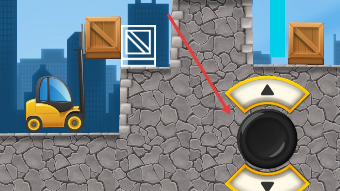 3、使用右边的按钮来控制叉车举起或放下木箱来越过障碍,放置到右侧指定区域完成任务。