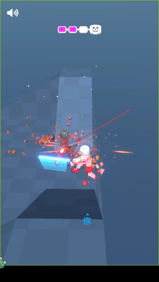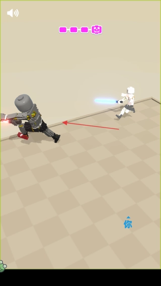1、观察敌人位置和行动轨迹,按红箭头方向操控角色接近敌人,同时留意上方粉色生命条,保持安全血量。