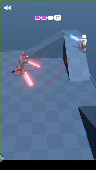 2、利用地形,如图中可借助高台等,在敌人靠近时占据有利位置,按红箭头指引选择合适时机攻击,躲避敌人激光剑反击。