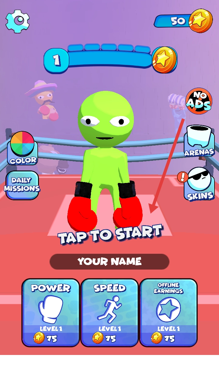 3、积累金币后,返回主界面,升级POWER、SPEED等属性,或解锁SKINS、ARENAS,提升战斗能力与体验。