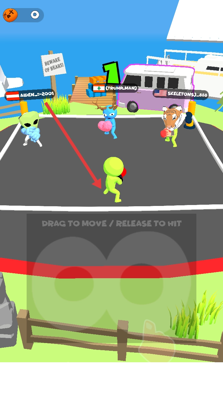 1. 点击“TAP TO START”启动,操控绿色拳击人物,在户外场地与其他角色进行对战,借助“DRAG TO MOVE / RELEASE TO HIT”机制展开战斗。