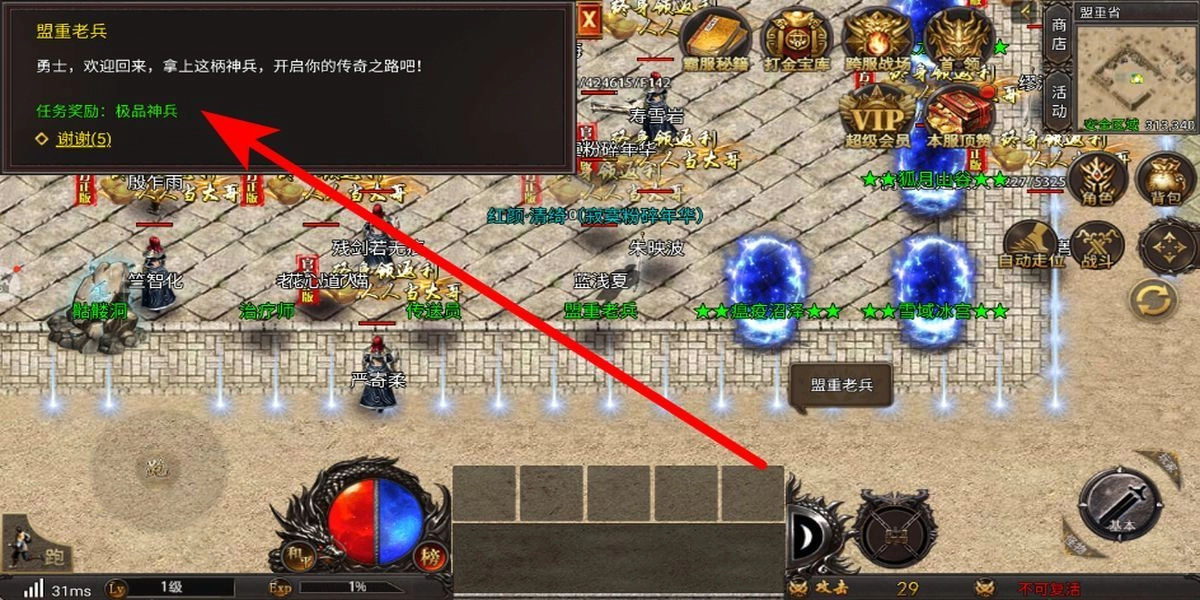 3、踏入游戏之后,寻得盟重老兵,与之进行交互来接取任务,依照指引朝着指定地点进发,完成一些简单操作,从而获取极品神兵奖励,为前期战斗配备强力装备。