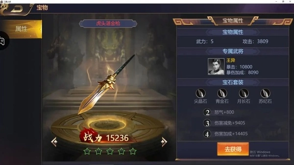 首占打开宝物全部,然后随意点开图鉴,左滑右滑找到你要培养的主力武将的专属宝物,比如王异的专属宝物是虎头湛金枪,如图:
