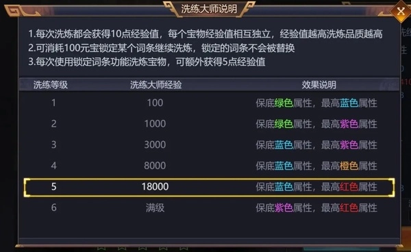 诸位君主在洗练时,要先把该宝物的洗练等级提升到5级,即洗练大师,因为5级才会出现红色词条
