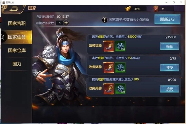 国家任务中捐赠类任务最省事,捐10.5万即可