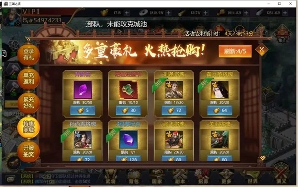 12. 新开的服务器,在主城界面的七日活动中有个特惠商城,里面能买到刘备、关羽、张飞的碎片。建议只购买刘备的碎片,关羽和张飞的碎片合成角色后就无需再关注。