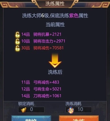 最后,刷出一个红色词条已然不易,若元宝充裕的君主期望获得双红词条或者三红词条,可在刷出一个红色词条后进行锁定,然后再去洗练。每次锁定一个词条并刷一次需花费100元宝,各位大佬可随意操作。