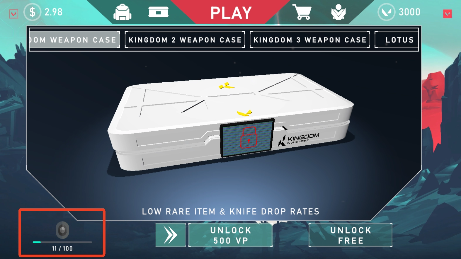 4、点击第二个箱子可以开始抽取武器了,点击下方UNLOCK就可以抽,第一个需要消耗500VP。