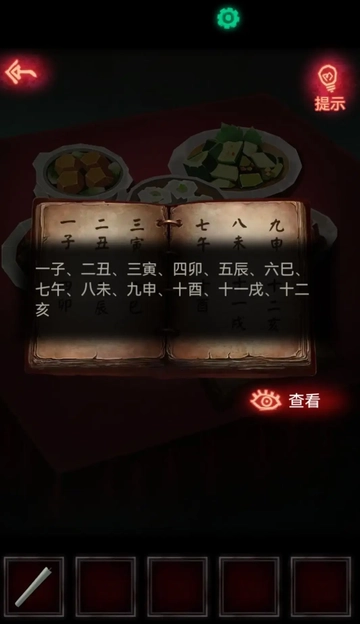 切换场景后,留意一下放置饭菜的桌子上的书籍提示,实际上就是十二地支大多都已背过,要是没背过,不妨找个本子记下来,这样一会儿查看也方便。