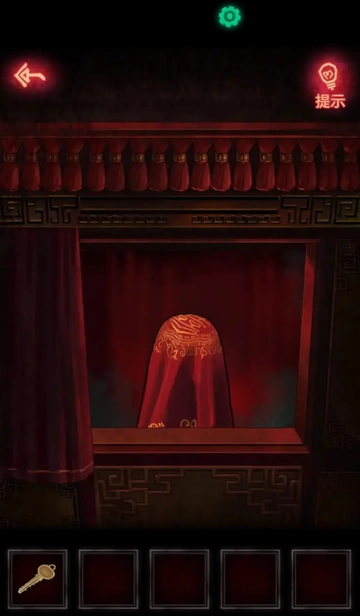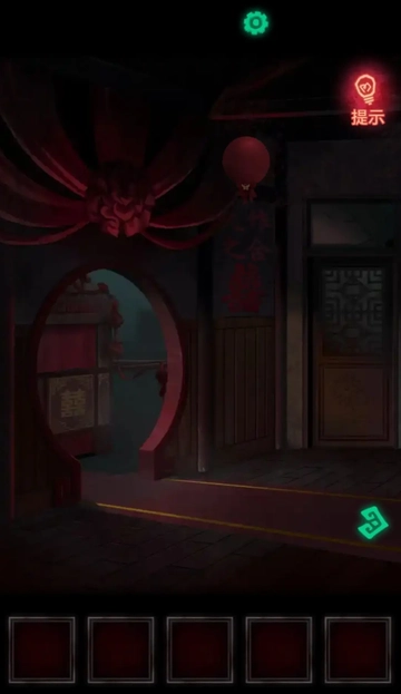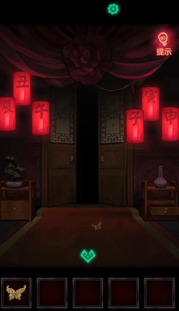出门时莫琪让我们锁门并寻找手镯。右上角灯笼处有一把很明显的蝴蝶钥匙,但拿不到。左边轿子打开后有个红盖头,同样够不着。不过在轿子的窗格上能拿到一把钥匙,接着回头打开之前小纸人右边的上锁抽屉,从中拿到剪刀。
