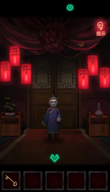 点击右上角再次切换场景,这里稍有高能。能看到小纸人正默默伸出小爪爪讨要钱财,场景中有六个灯笼。将没亮的灯笼点亮,没有蜡烛的灯笼放上蜡烛后再点亮,如此操作便能得到密码“辰丑午子寅申” 。把这组密码换算成数字,即527139,这就是箱子密码,待会会用到。